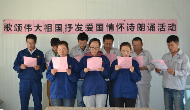 此次活動(dòng)不僅豐富了一線(xiàn)員工的業(yè)余生活使他們的精神得到短暫的放松,更是表達了我公司一線(xiàn)員工對祖國與兵團的熱愛(ài)之情。這一首首紅歌、一首首詩(shī)歌時(shí)而讓人如沐春風(fēng),時(shí)而讓人熱情澎湃,充滿(mǎn)感情的起伏在129春光油田五五新鎮隊點(diǎn)建設工程施工場(chǎng)地上方盡情流淌徘徊。
