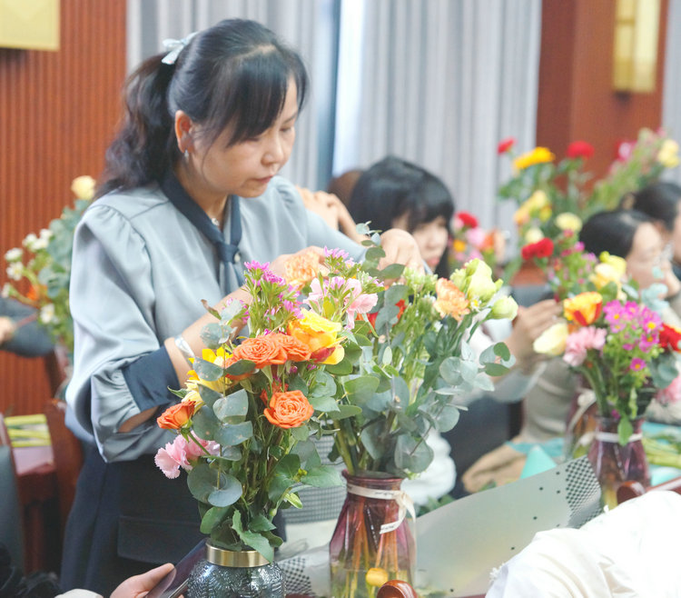 活動(dòng)中,花藝老師為大家介紹了鮮花常識、色彩搭配、插花技巧、保鮮方法等注意事項,對插花的技巧進(jìn)行現場(chǎng)講解和演示。在老師的耐心指導下,大家認真挑選花材、構思造型,選花、去葉、剪接、設計、插花,在一剪一修間,體會(huì )插花的樂(lè )趣。一盆盆細致精美、別出心裁的插花作品展現在大家的面前,充分展示著(zhù)女職工熱愛(ài)生活、昂揚向上、追求真善美的精神風(fēng)貌。在場(chǎng)的每個(gè)人臉上都洋溢著(zhù)幸福燦爛的笑容。